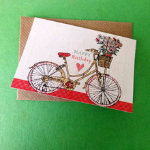 A range of gorgeous bright and colourful occasion 'mini' cards. They are great to have around the house, and for putting a smile on someone's face. The wording on this design featuring a shopper bike and a pot plant in the basket reads: 'Happy birthday'. This sized card measures A7 - similar to a business card size.