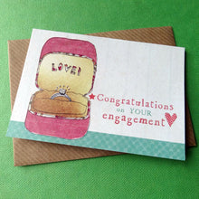 A range of gorgeous bright and colourful occasion 'mini' cards. Great to have around the house, and perfect for putting a smile on someone's face. The wording on this design featuring an engagement ring inside a box reads: 'Congratulations on your engagement'. This sized card measures A7 - similar to a business card size.