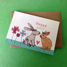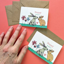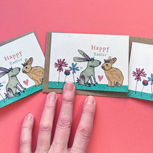A range of gorgeous bright and colourful occasion 'mini' cards. They are great to have around the house, and for putting a smile on someone's face. The wording on this design featuring 2 happy rabbits and some flowers reads: 'Happy Easter'. This sized card measures A7 - similar to a business card size.