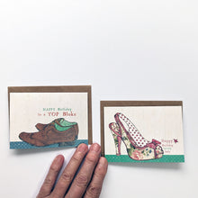 A range of gorgeous bright and colourful occasion 'mini' cards. They are great to have around the house, and for putting a smile on someone's face. The wording on this design featuring a pair of gorgeous high heeled shoes reads: 'Happy birthday lovely lady'. This sized card measures A7 - similar to a business card size.