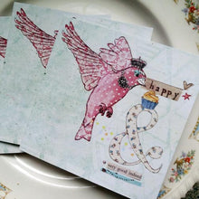 2. Pink bird: This card features a flying bird, a cupcake and an ampersand! The text reads ‘Happy [&] very good indeed’.