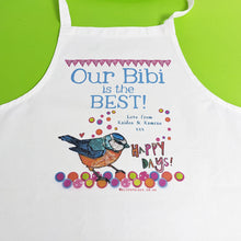 The wording on the apron reads: [Name of your choice] is the chirpiest! or [words of your choice]'. The wording by the bird reads 'Happy days!'.