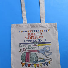 Many people start crochet as therapy and are hooked for life - these useful fold away bags make really lovely keepsakes and are great for storing all the yarn, hooks, pattern essentials, and crochet goodness. Personalise with any name, ie for your Grandma, Nan, Gran, Nanny, your neighbour, a niece or a friend who has just taken up the hobby, it's not just for the golden oldies these days!