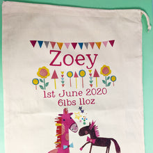 A wonderful gift for a newborn - this adorable hand illustrated sack can be personalised with any name, birth date and birth weight. Great for storing all the usual mementos of a new baby such as the hospital band, scan photos, and first toys. It can be used for collecting gifts from guests for the new arrival, and will be a useful keepsake for years to come for all the favourite toys to be kept in.