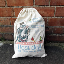 This sack design features either a dog (choose from our extensive list of breeds - see our images), cat, rabbit or guinea pig. - The message printed on the sack reads: Merry Christmas to '[name of your choice] Best [design of your choice] in the world ever...'.