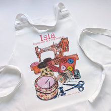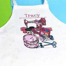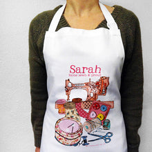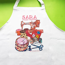A personalised cotton apron with a beautiful illustration featuring a 'singer' sewing machine and the essential accessories.
