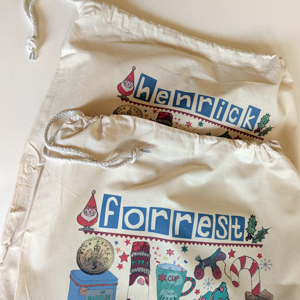 Printed in England and bursting with festivity, these delightful personalised Christmas gift sacks are suitable for all ages and will give you years of enjoyment. Large enough for a very generous Father Christmas, they liven up any merry interior!