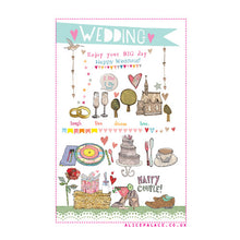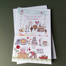 Our range of 'story' greeting cards cover all celebrations and are suitable for friends and family. On the front of this wedding design featuring the story of a wedding day including the bride and groom shoes, a bale of hay, cutlery, a wedding cake, a church, some champagne glasses and the wedding bands it says 'Enjoy your BIG day, Happy Wedding!’. Then the other smaller wording reads 'laugh, live, dream, love. Happy couple!'